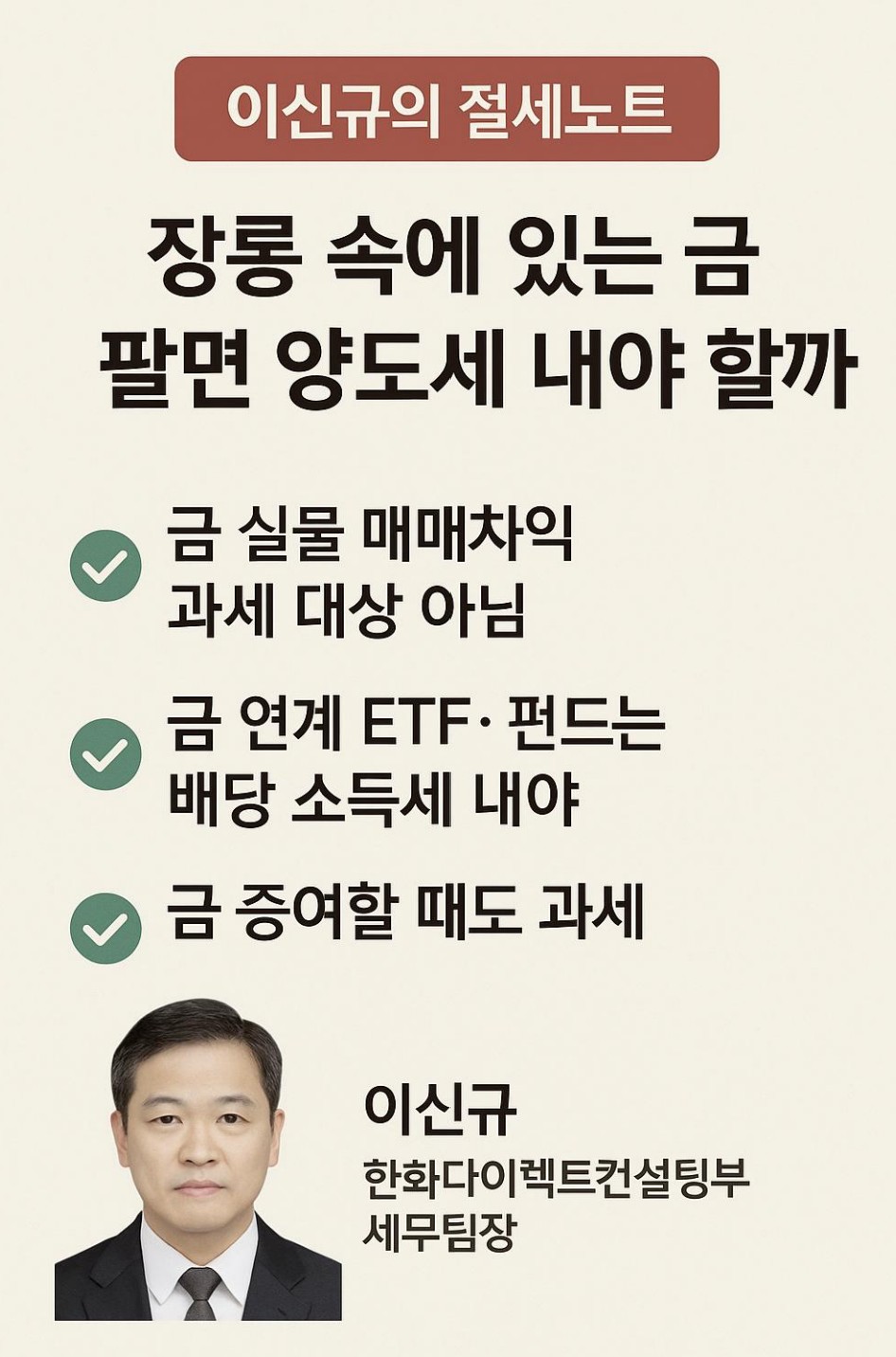 → 개인이 실물 금을 사고팔아 발생한 이익에는 양도소득세가 부과되지 않음. - 금 연계 ETF·펀드는 배당 소득세 내야