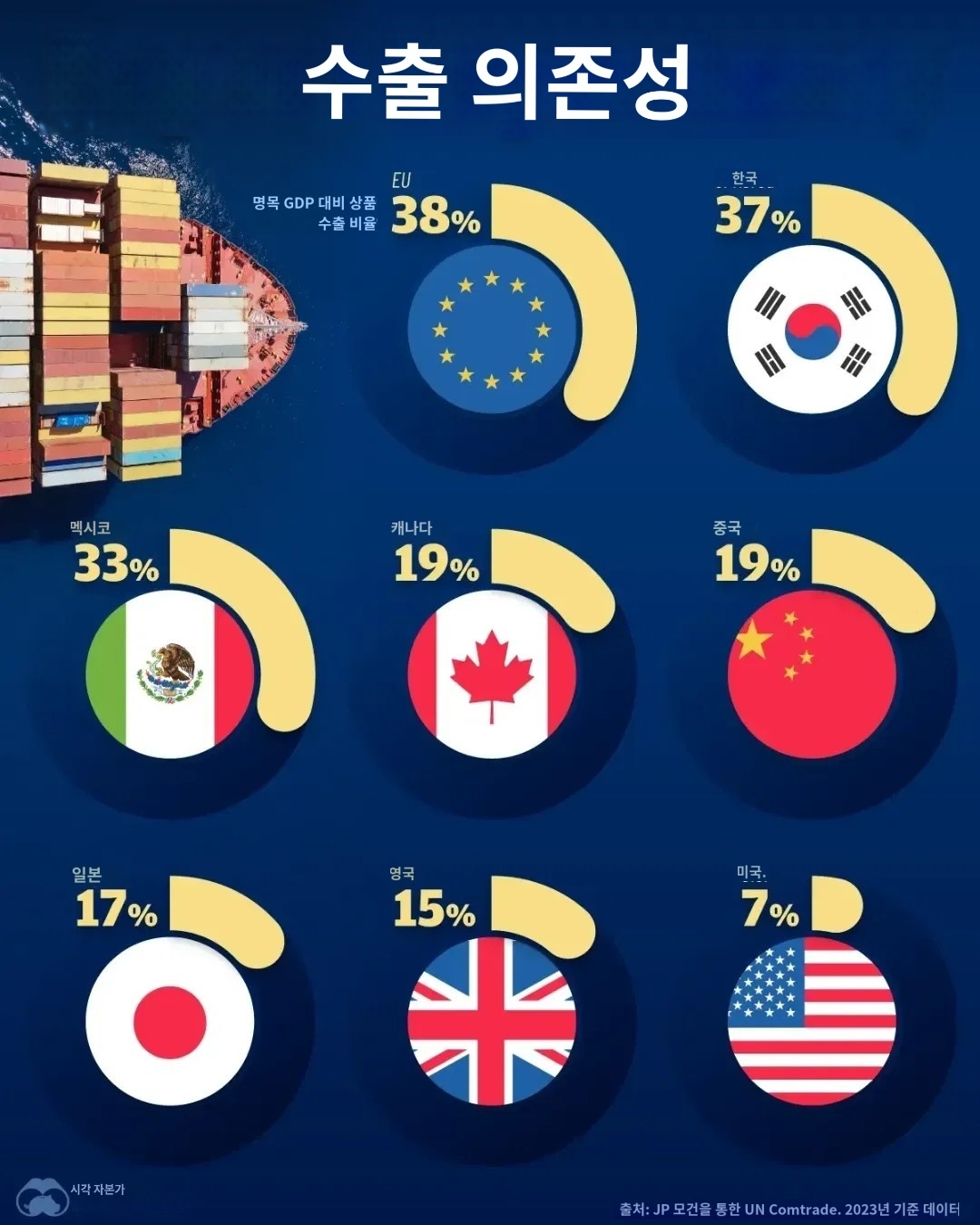 | 2 | 🇰🇷 대한민국 | 37% | 수출 주도형 경제 (반도체, 자동차, 선박 등) |