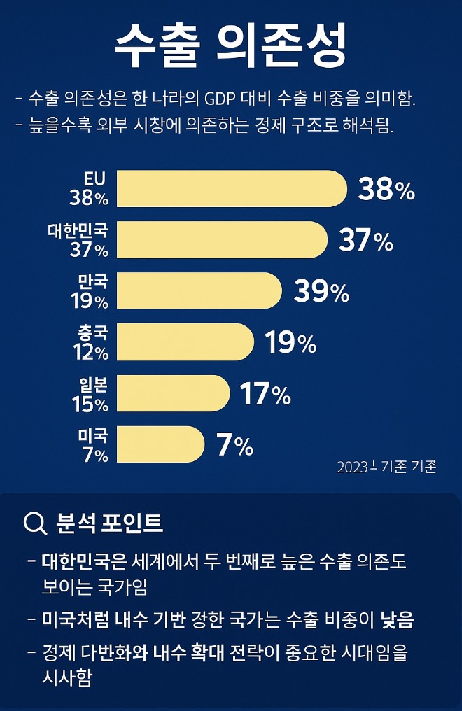 - 의미: 수출 의존성은 한 나라의 GDP(국내총생산) 대비 수출이 차지하는 비중을 말합니다.