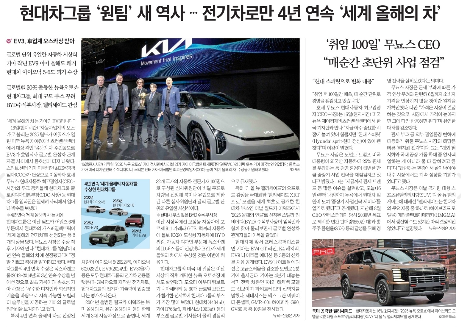 - 2025 세계 여성 올해의 차: 현대차 싼타페(대형 SUV 부문), 기아 EV3(컴팩트 SUV 부문) 수상