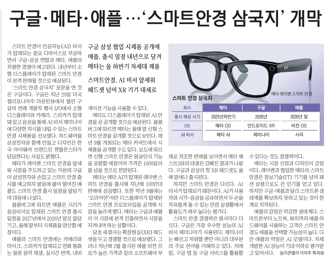 • 2025~2026년은 ‘스마트 안경 삼국지’ 시대의 시작으로, 소비자들은 스마트폰 이상의 새로운 경험을 하게 될 가능성이 큽니다.