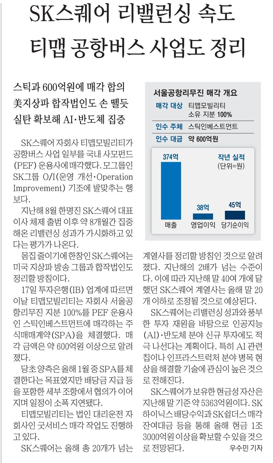 17. SK스퀘어 리밸런싱 속도 티맵 공항버스 사업도 정리