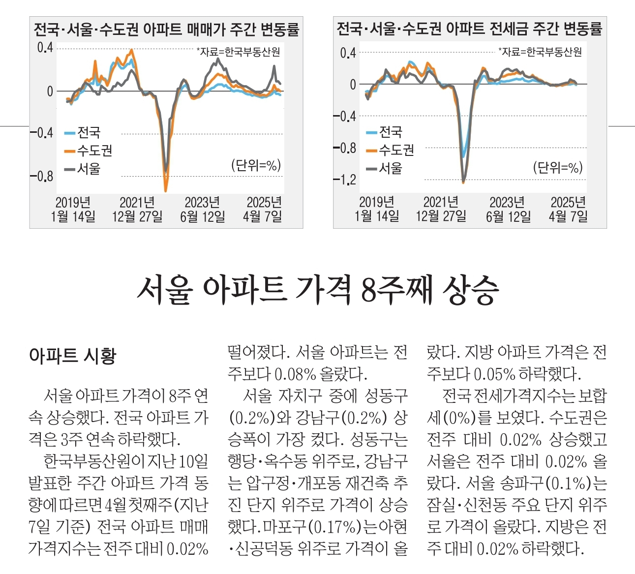 1. 전국. 서울. 수도권 아파트 매매가 주간 변동률 서울 아파트 가격 8주째 상승