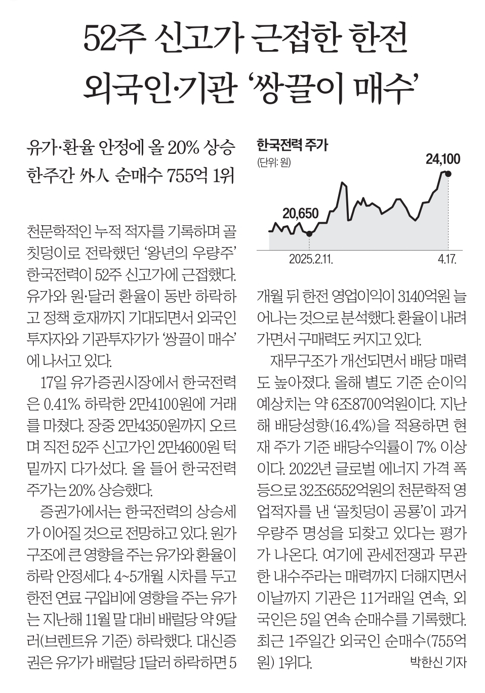 18. 52주 신고가 근접한 한전 외국인. 기관 "쌍끌이 매수"