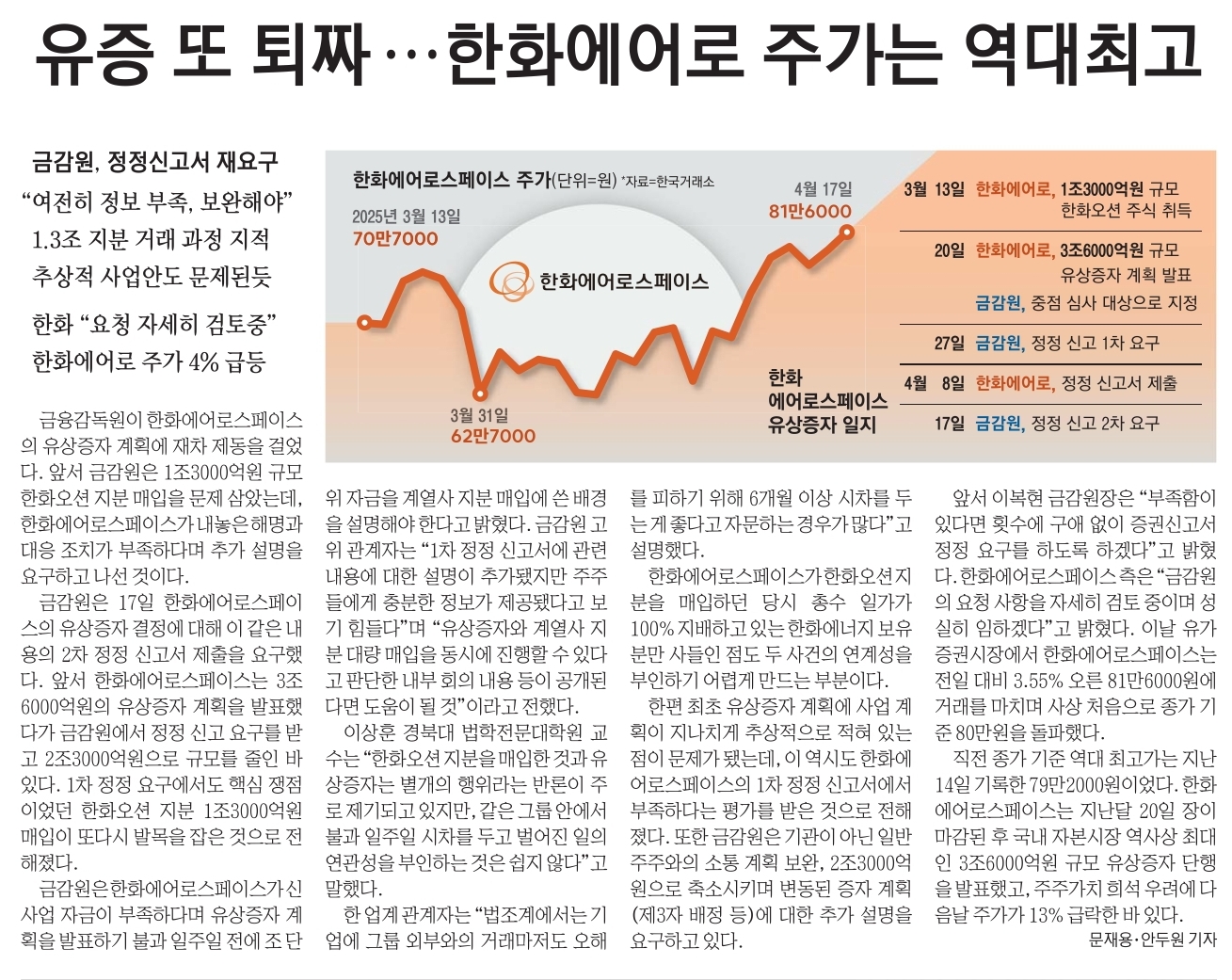 15. 유증 또 퇴짜 -- 한화에어로 주가는 역대최고