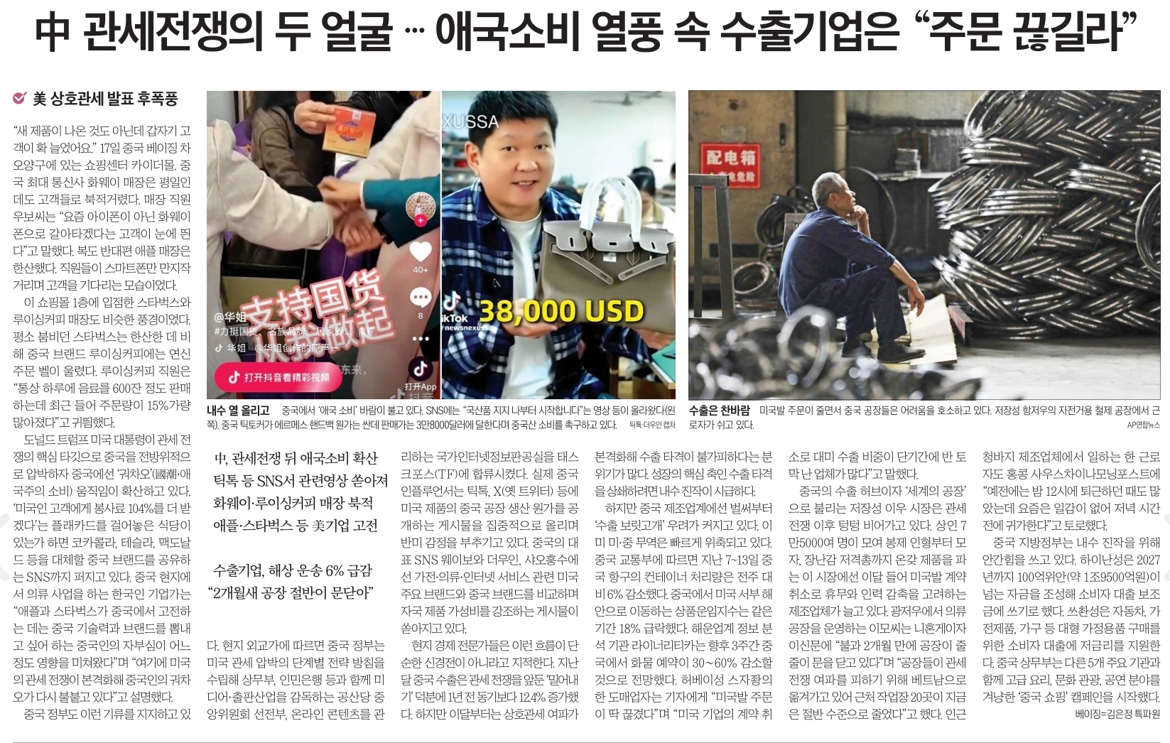 27. 中 관세전쟁의 두 얼굴 -- 애국소비 열풍속 수출기업은 "주문 끊길라"