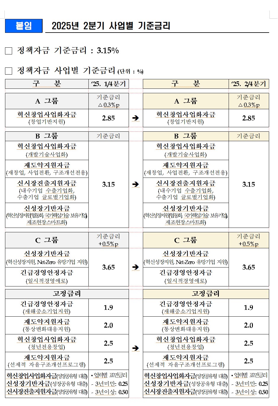 20252/4분기 정책자금 기준금리를 다음과 같이 알려 드리오니, 참고하시기 바랍니다.