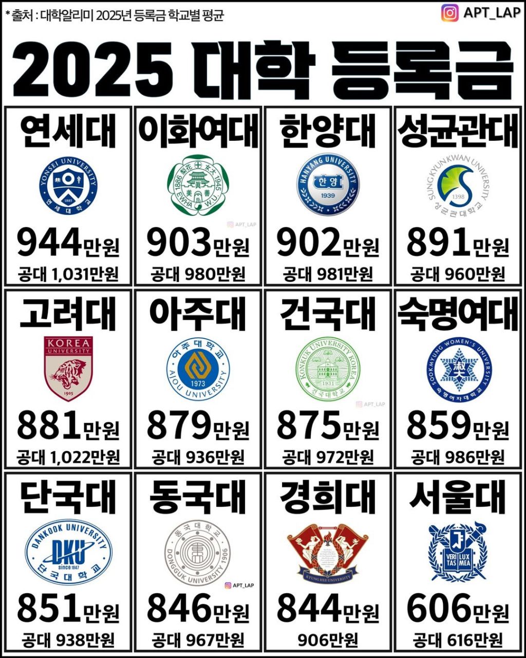 🟥 서울대학교는 국립대로 등록금이 가장 낮음