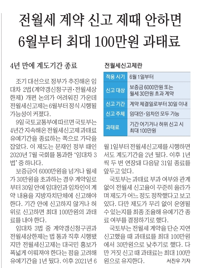5. 전월세 계약 신고 제때 안하면 6우러부터 최대 100만원 과태료