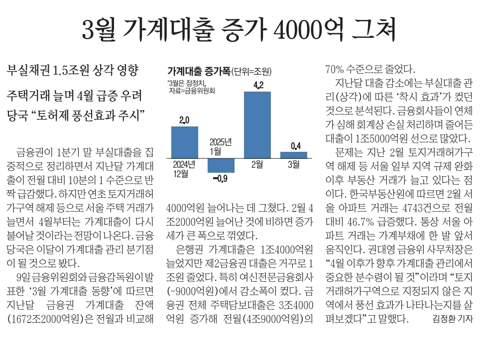 12.3월 가계대출 증가 4000억 그쳐