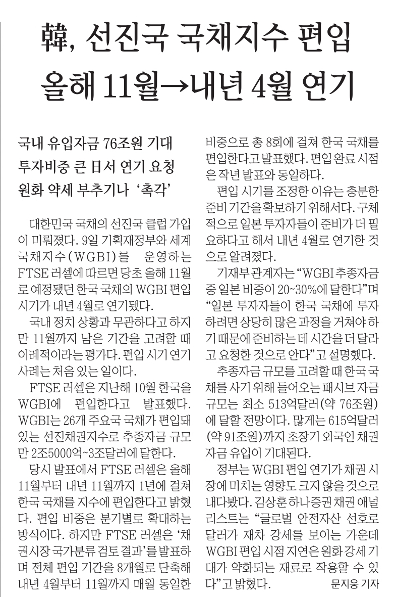 15. 韓, 선진국 구채지수 편입 올해 11월 → 내년 4월 연기