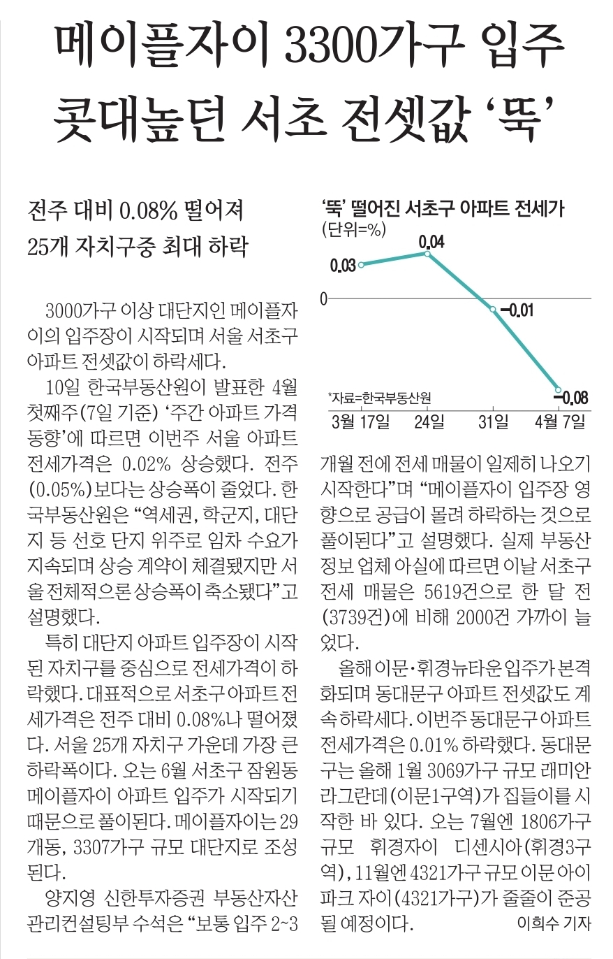 5. 메이플자이 3300가구 입주 콧대높던 서초 전셋값 '뚝'
