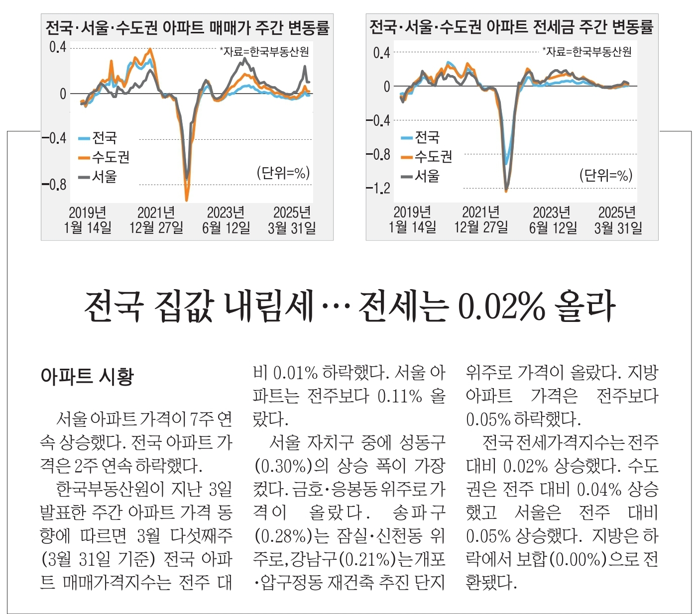 1.  전국 집값 내림세  -- 전세는 0.02% 올라