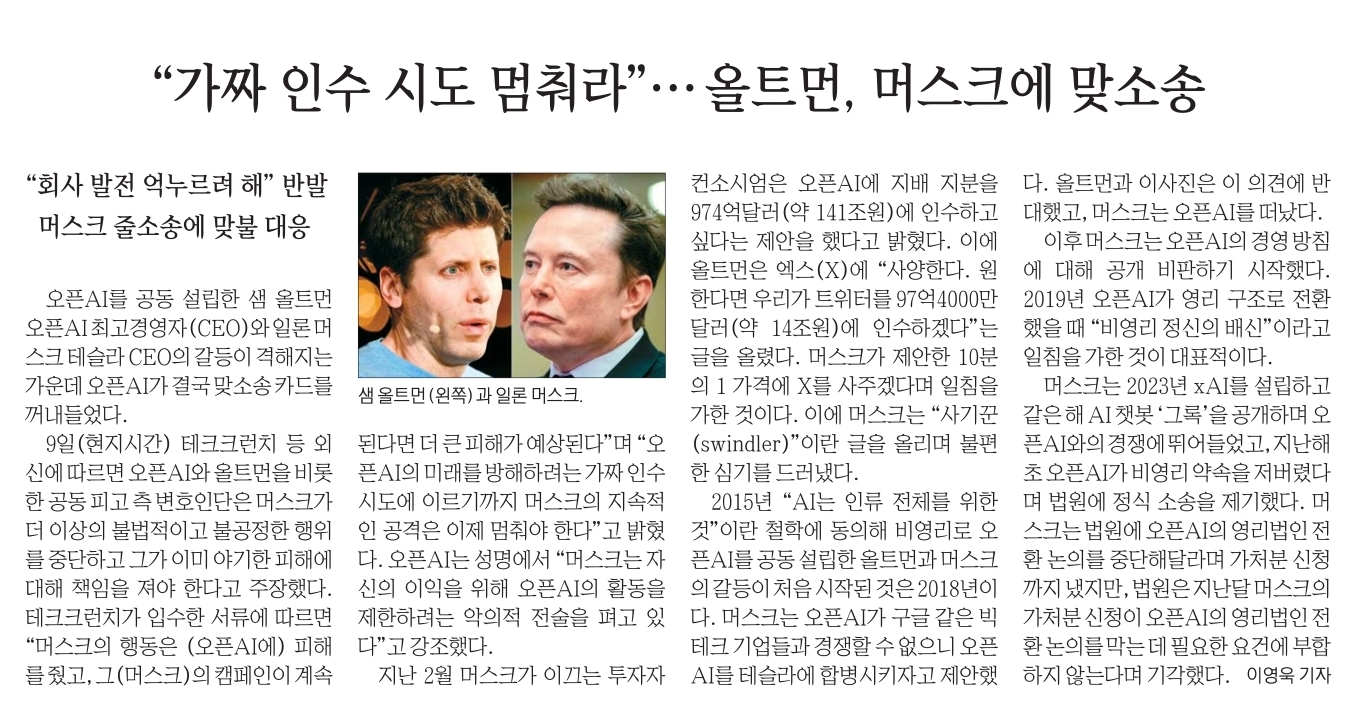 26.  "가짜 인수 시도 멈춰라" -- 올트먼, 머스크에 맞소송