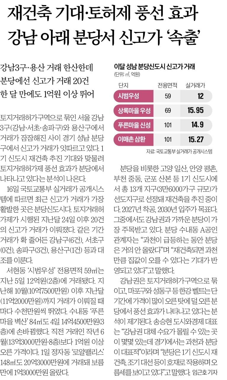 10. 재건축 기대. 토허제 풍선 효과 강남 아래 분당서 신고가 '속출'