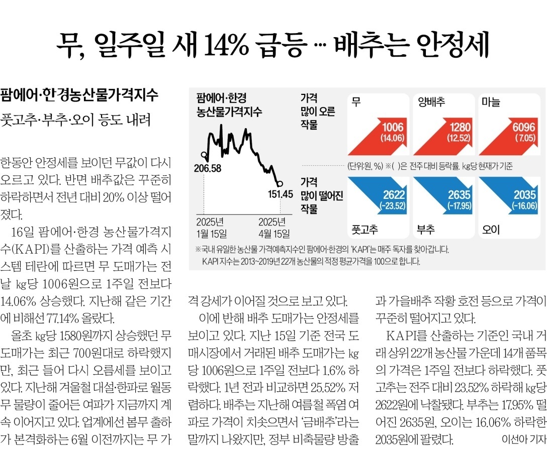 17. 무, 일주일 새 14% 급등 -- 배추는 안정세