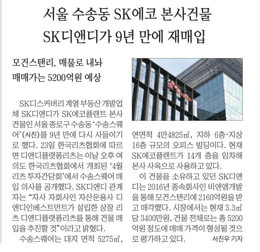 9.  서울 수송동 SK에코 본사건물 SK디앤디가 9년 만에 재매입