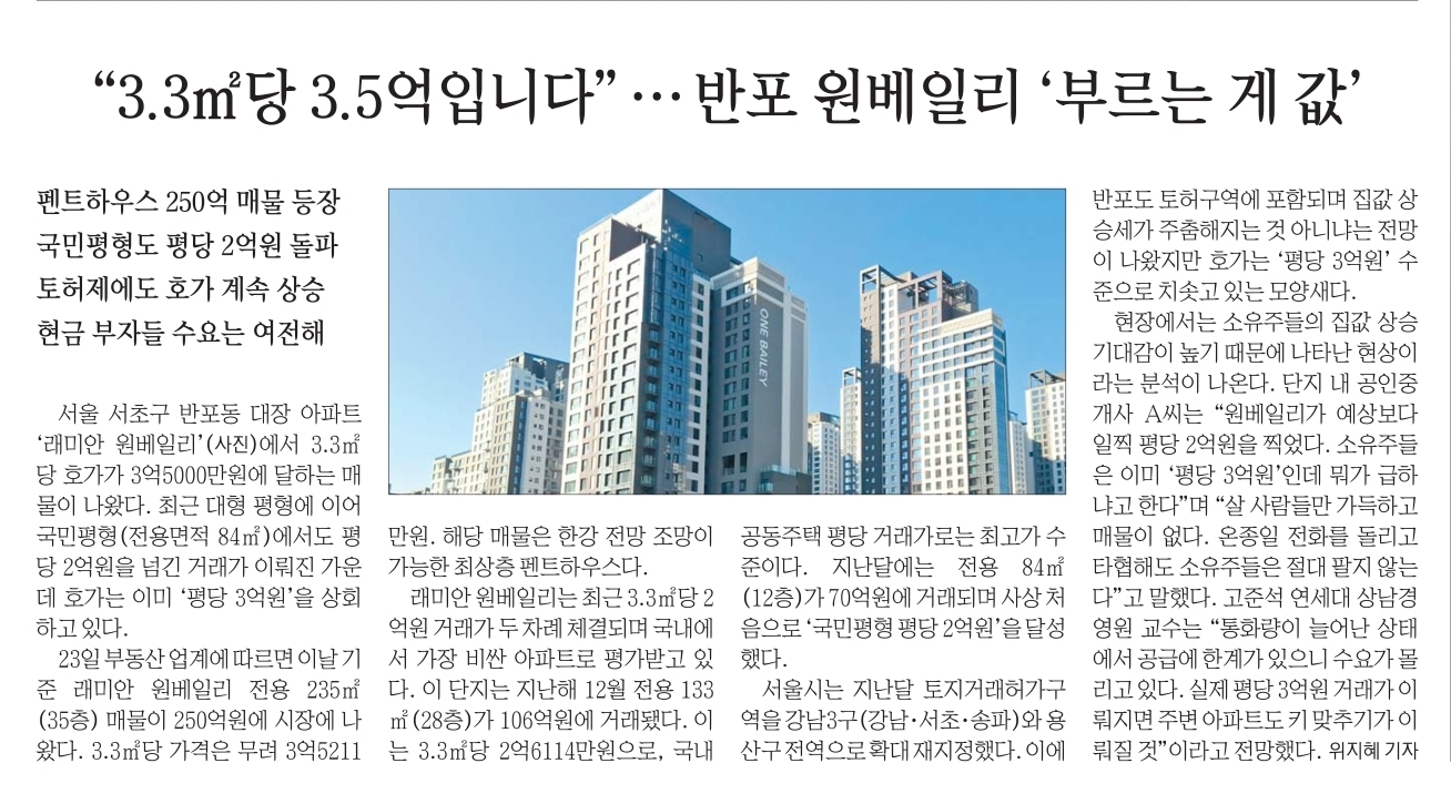 2.  "3.3㎡당 3.5억입니다"  --  반포 원베일리 '부르는 게 값'