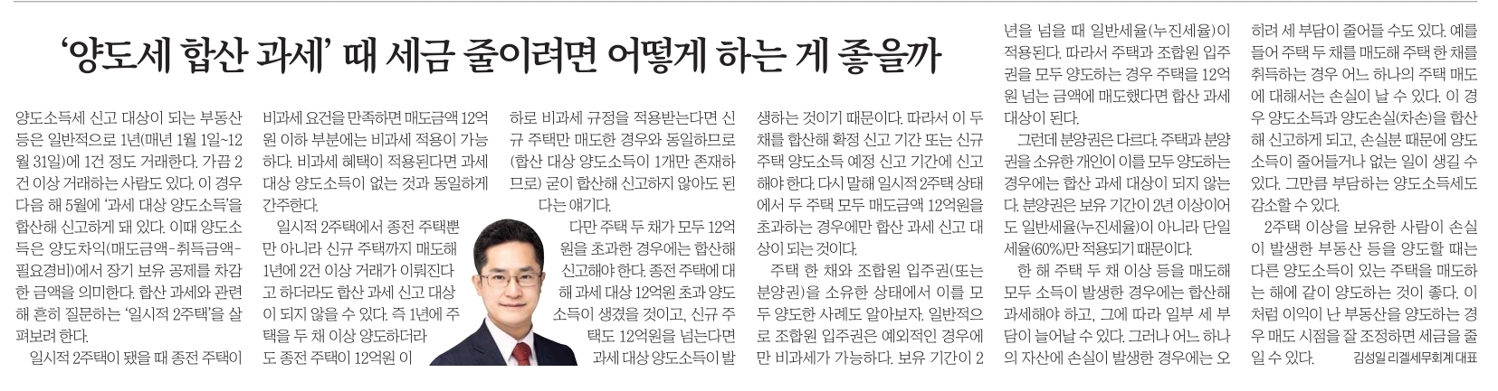 11.  '양도세 합산 과세'때 세금 줄이려면 어떻게 하는 게 좋을까
