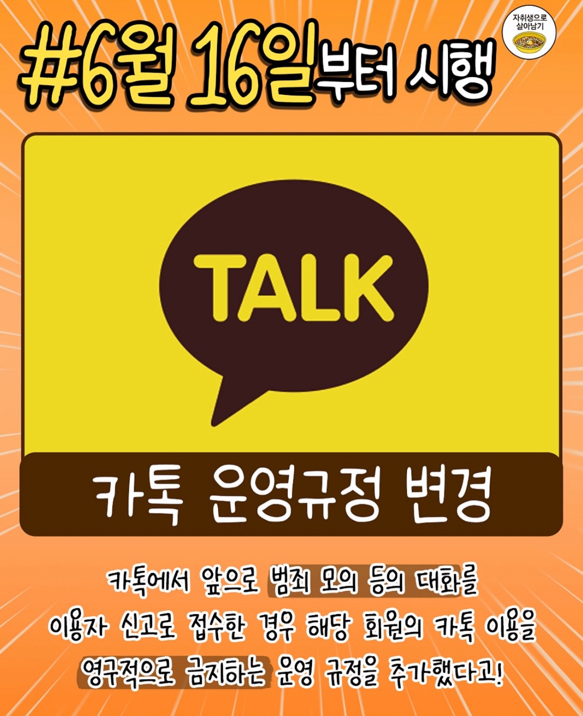 | 6월 16일부터 시행 | 카톡 운영규정 변경 | 카톡에서 앞으로 범죄모의 등의 대화를 이용자 신고로 접수한 경우 해당 회원의 카톡 이용을 영구적으로 금지하는 운영 규정을 추가했다고! |