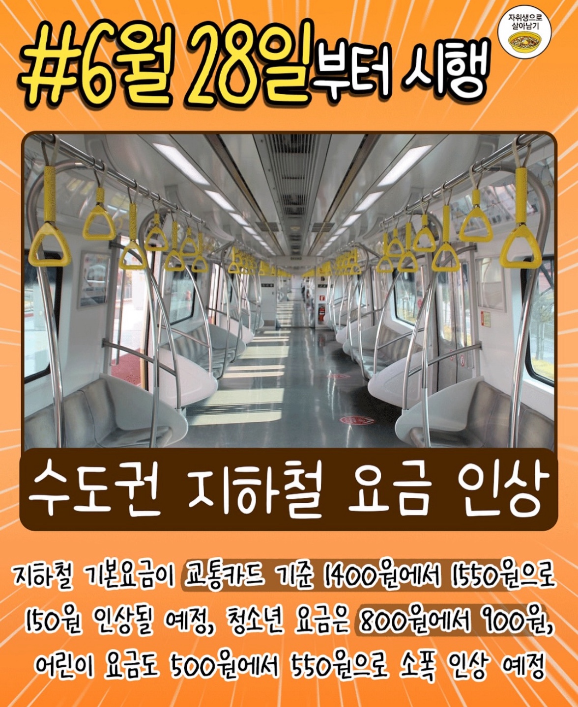 | 6월 28일부터 시행 | 수도권 지하철 요금 인상 | 지하철 기본요금이 교통카드 기준 1400원에서 1550ㅐ원으로 150원 인상될 예정, 청소년 요금은 800원애서 900원, 어린이요금도 500원에서 550원으로 소폭 인상 예정 |