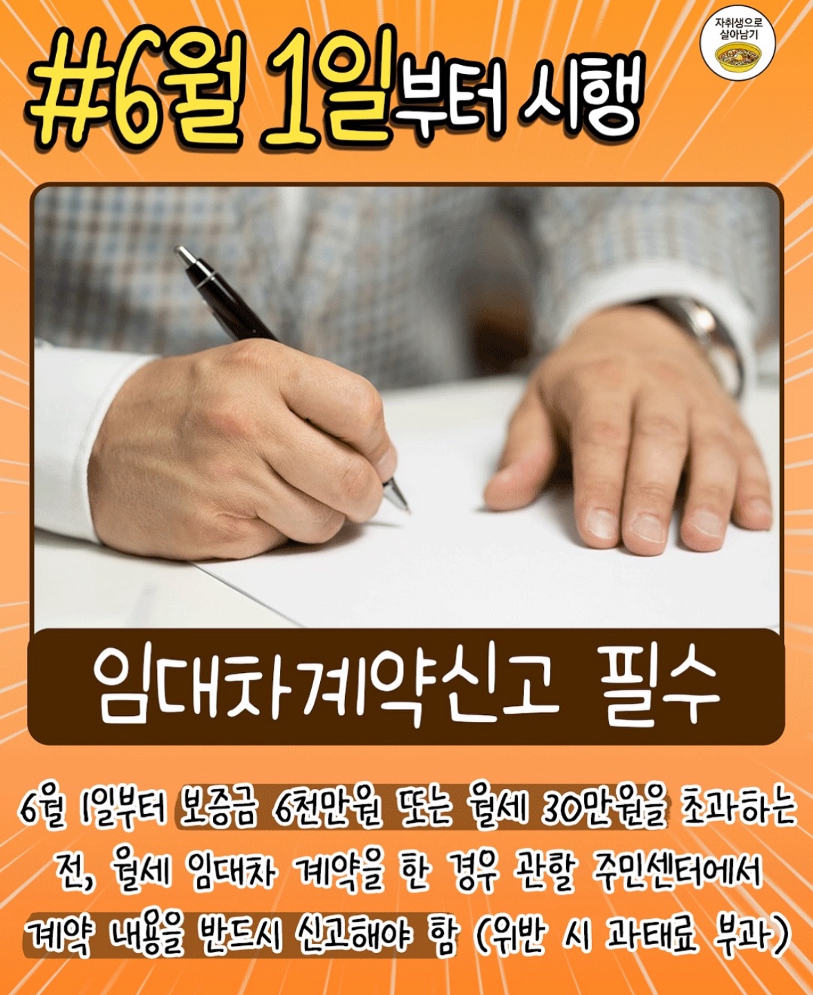| 6월 1일부터 시행 | 임대차계약신고 필수 | 6월 1일부터 6천만원 또는 월세 30만원을 초과하는 전, 월세 임대차 계약을 한 경우 관할 주민센터에서 계약 내용을 반드시 신고해야 함 (위반시 과태료 부과) |