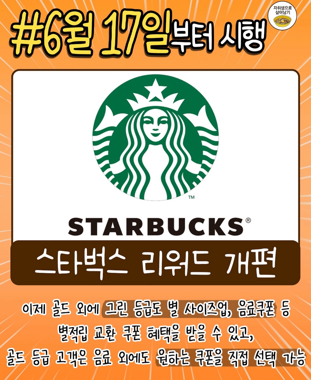 | 6월 17일부터 시행 | 스타벅스 리워드 개편 | 이제 골드 외에 그린 등급도 별 사이즈업, 음료쿠폰 등 별적립 교환 쿠폰 혜택을 받을 수 있고, 골드 등급 고객은 음료외에도 원하는 쿠폰을 직접 선택 가능 |