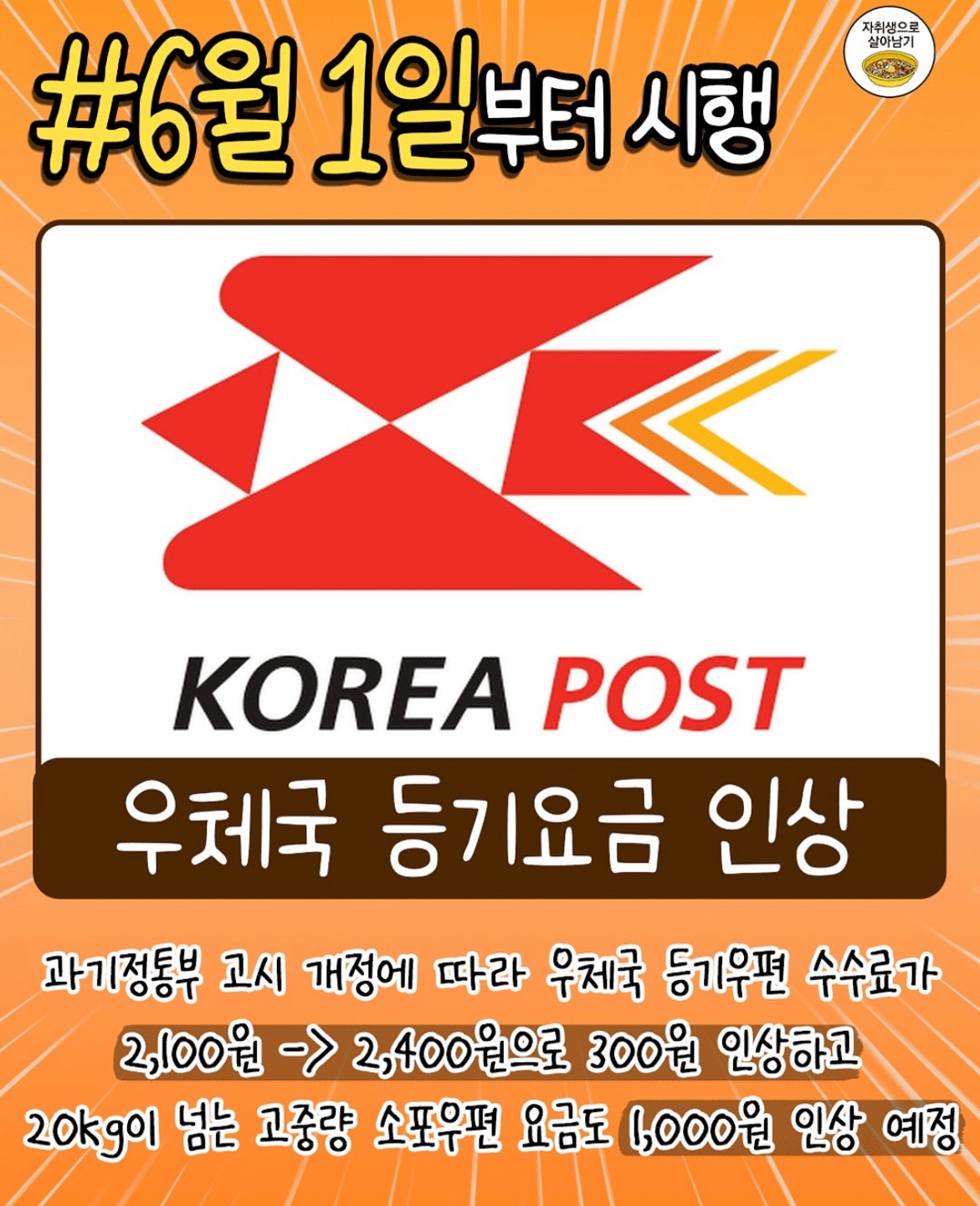 | 6월 1일부터 시행 | 우체국 등기요금 인상 | 과기정통부 고시 개정에 따라 우체국 등기우편 수수료가 2100원에서 2400원으로 300원 인상하고 20KG이 넘는 고중량 소포우편 요금도 1000원 인상 예정 |