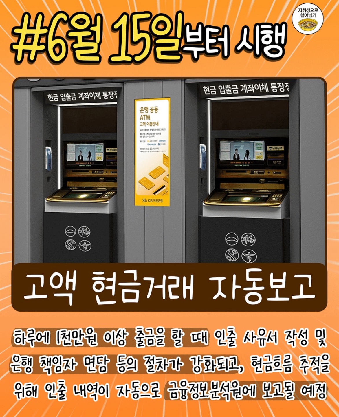 | 6월 15일부터 시행 | 고액 현금거래 자동복 | 하루에 1천만원이상 출금을 할때 인출 사유서 작성 및 은행 책임자 면담등의 절차가 강화되고, 현금흐름 추적을 위해 인출 내역이 자동으로 금융정보분석원에 보고될 예정 |
