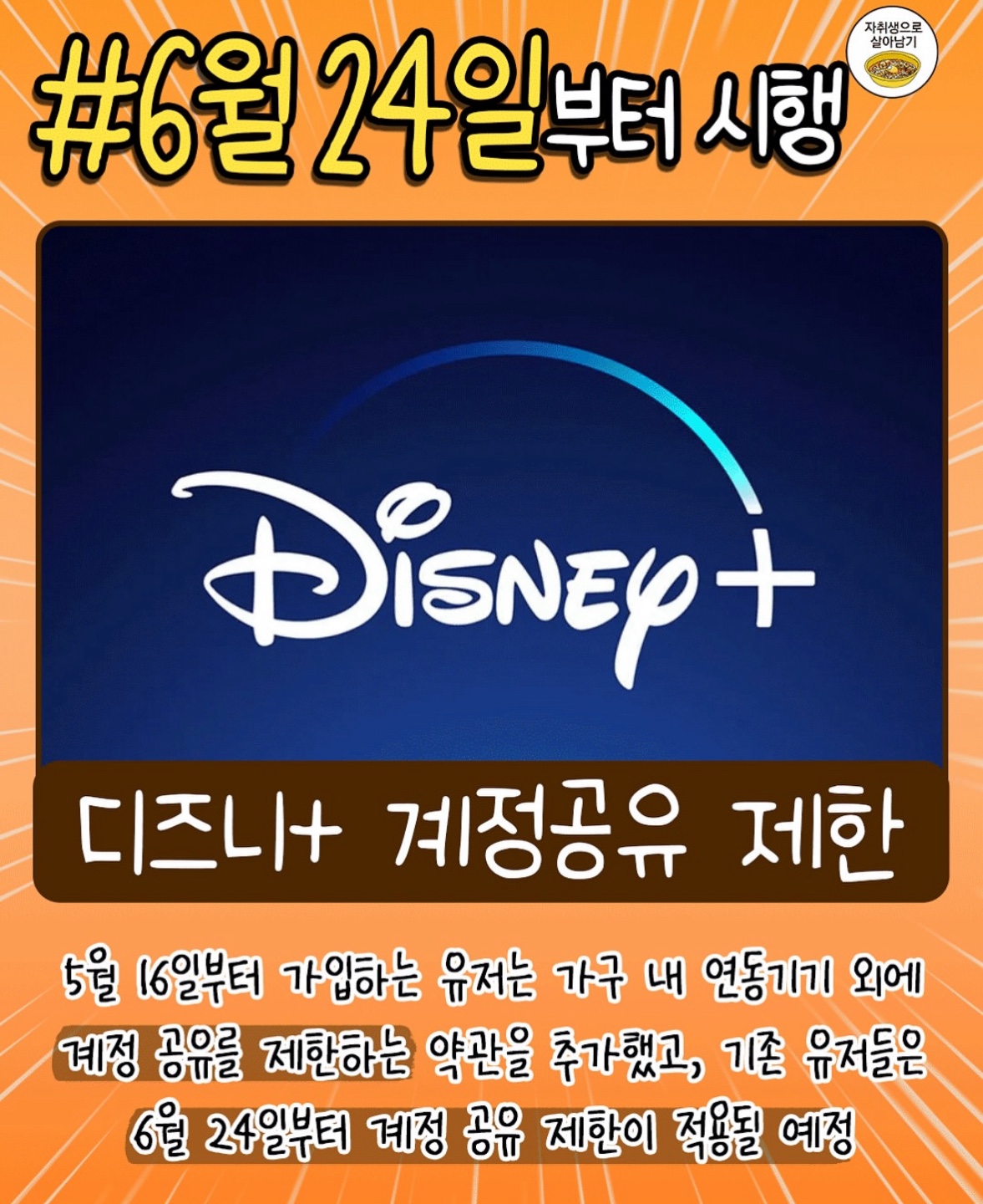 | 6월 24일부터 시행 | 디즈니 + 계정공유 제한 | 5월 16일부터 가입하는 유저는 가구내 연동기기 외에 계정 공유를 제한하는 약관을 추가했고, 기존 유저들은 6월 24일부터 계정 공유 제한이 적용될 예정 |