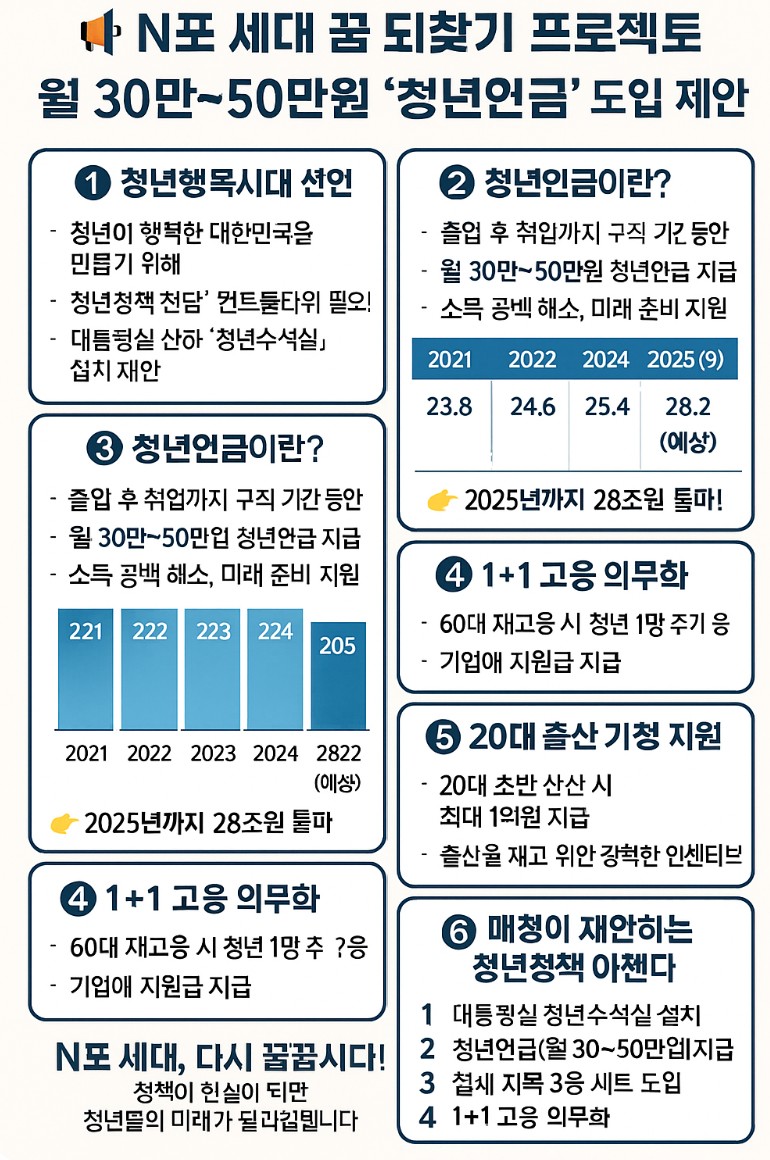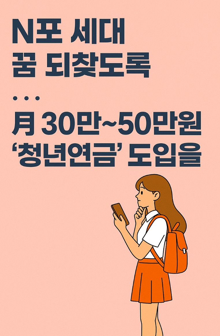 졸업 후 취업까지 경제적 어려움을 겪는 청년들에게 **월 30만~50만원 규모의 ‘청년연금’**을 지급하는 방안이 논의되고 있다.